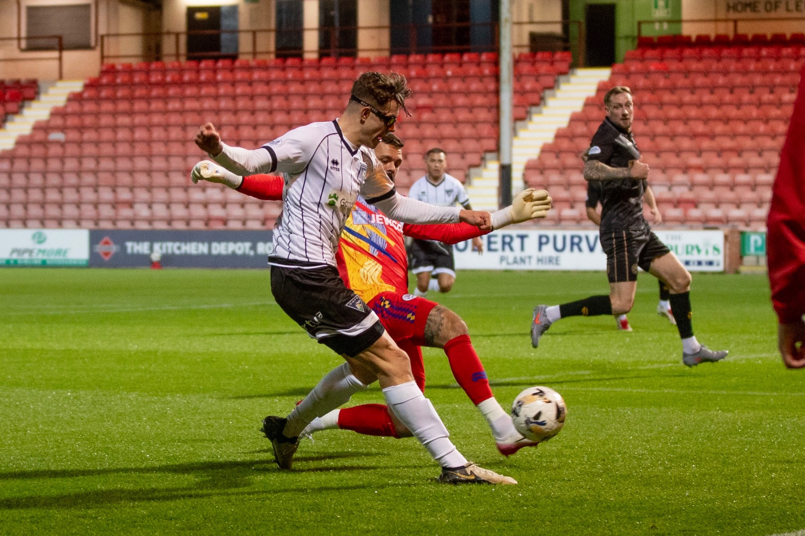 Dylan Watret was shown a second yellow in 92 minutes as he axed Todd. The 24 year-old Pars academy graduate took the free kick himself but he hit it low and the ball was cleared. Tyrell recovered the ball on the right side in his own half switched it to Fraser and his long ball found Benedictus who headed on for Kane. It was a fantastic opportunity to be the hero but alas his shot went wide right.