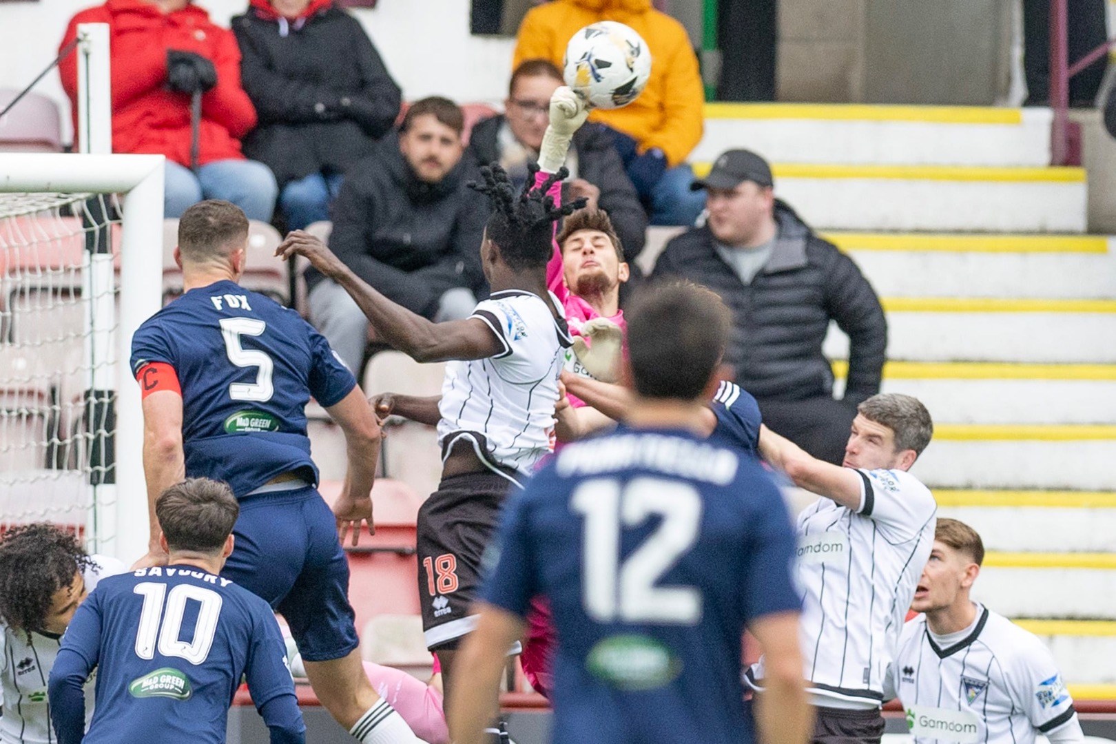 The tail of Storm Amy was still chilling the ground as this Scottish Championship kicked off with Dunfermline attacking the goal at the Vertu Community Stand end. Two Pars free kicks in the opening five were launched into the visitors` box for Calum Ferie to clutch before Rory Macleod got in the first shot of the afternoon but from 20 yards out that went wide right.