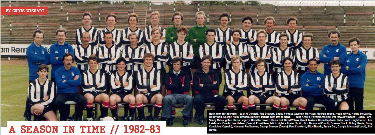 His decision to release Kenny Thomson was both bewildering and deeply unpopular with the fans. Kenny moved to Alloa and another stalwart, Bonar Mercer, retired. Coming in was the experienced Bobby Ford from Raith Rovers, along with youngsters Paul Crawford, Trevor Smith, Colin Grant and Kevin Hepburn. On the fringes were Graeme Black, Graham Buckley, Dave McGovern and Paul Scullion. Doug Considine was made captain and Jim Leishman was added to the coaching staff. Long serving chairman Andrew Watson retired and was replaced on the board by local businessman Bill Braisby who was a valued sponsor.