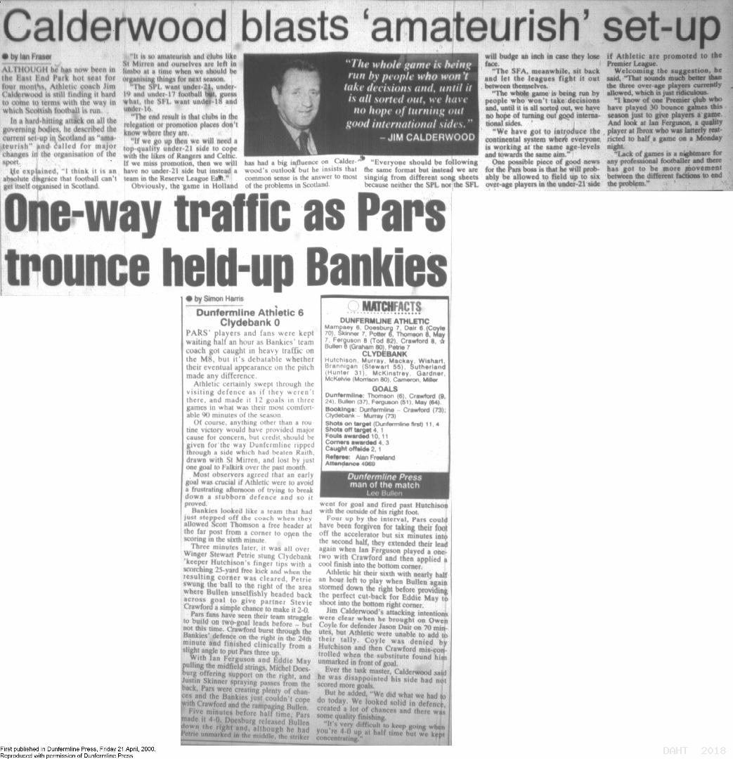 Saturday, 15th Apr 2000 Match Report 21/04/2000 (Clydebank(h))