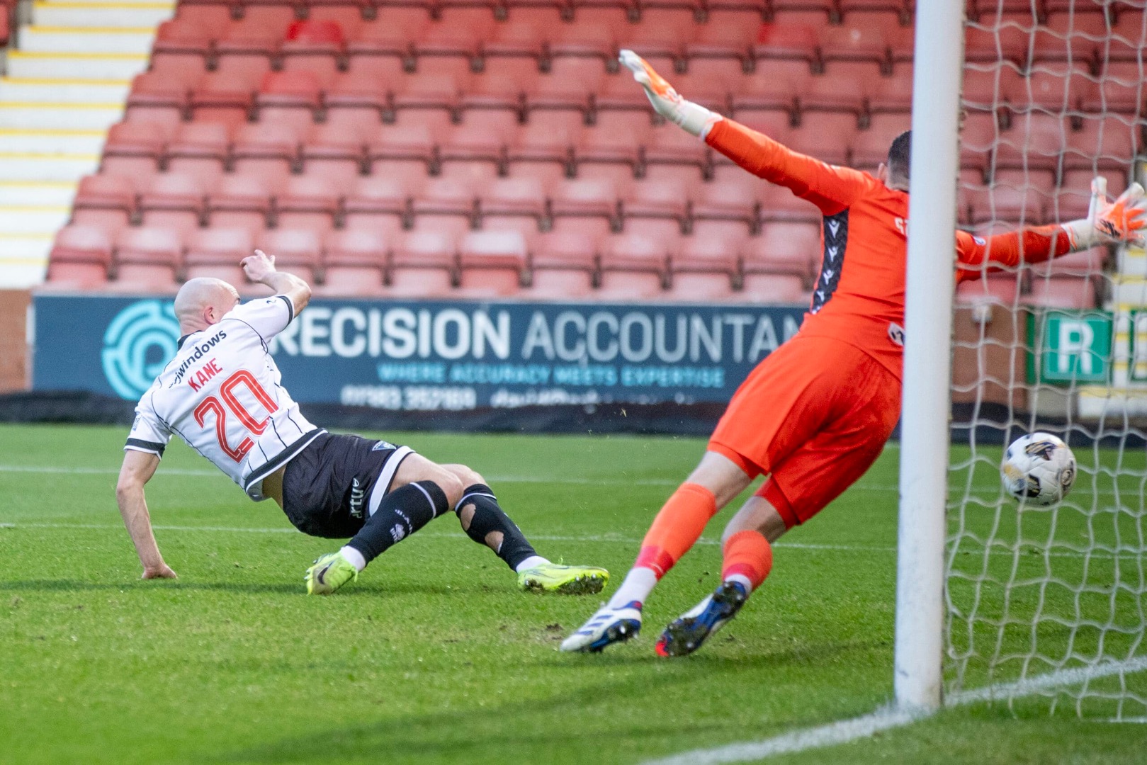 The Doonhamers lead would last only three minutes. Dunfermline reacted with two Matty Todd shots that keeper Ross Stewart tipped firstly wide and secondly over his crossbar. The equaliser would come from a Todd cross from the right side right into the heart of the Queens box. Bray got a touch to flick it on to KANE to his left and the striker made no mistake in finding the net. 1-1